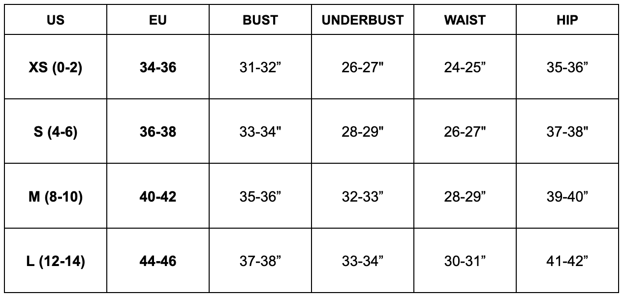 The chart above outlines body measurements in inches. Please note fit may vary depending on the style and fabric of each garment. Any styles with different sizing will be noted in the product details.